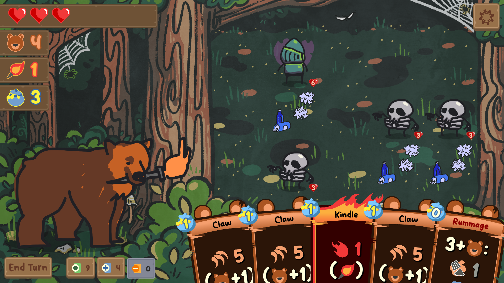 Protect the world from hordes of monsters with grizzly prowess and a magic torch! A roguelite deckbuilder where you have Bear cards and Torch cards, which get stronger the more of each you have in your hand paw. After every battle, choose a pack of 3 cards to add to your deck. Can you survive all 5 levels?
